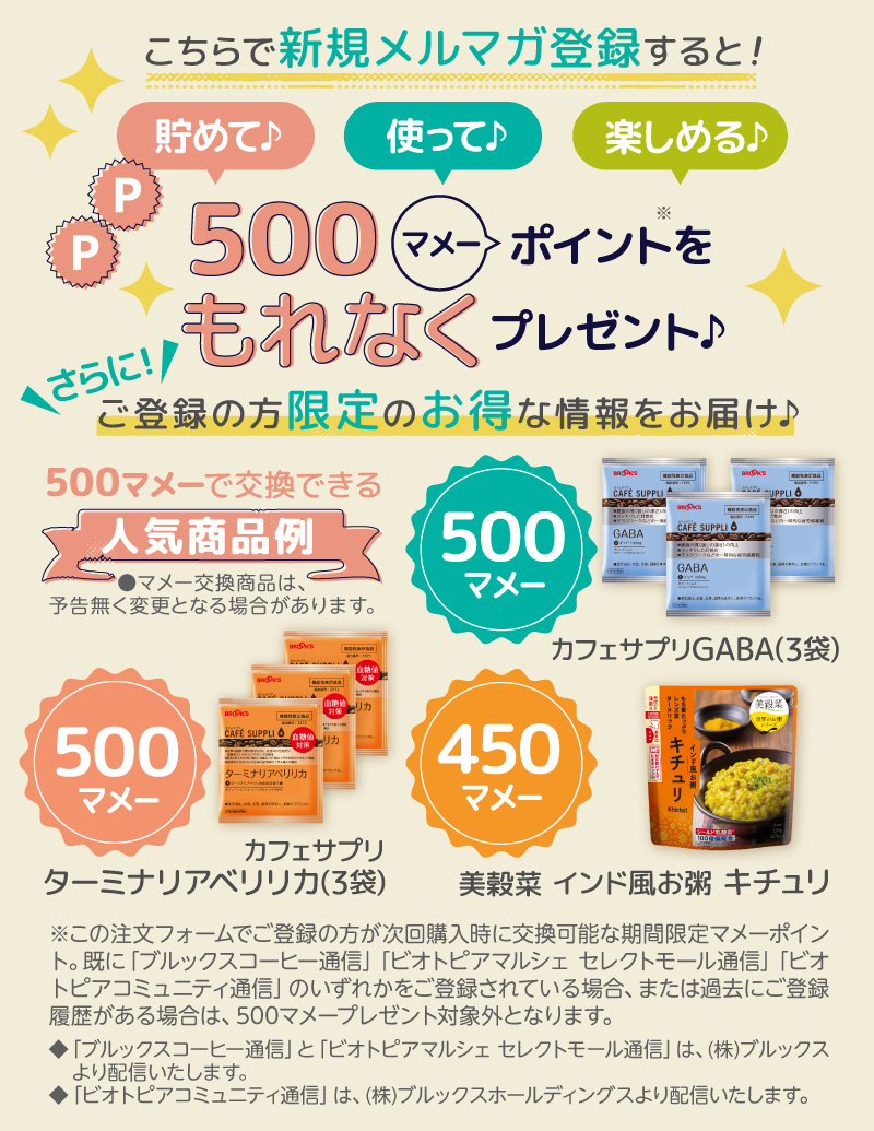 初めてのご注文には新規会員登録が必要です。 「ビオトピアマルシェ セレクトモール」・「ブルックスコーヒーマーケット」にご登録のある方は、こちらからログインしてお進みください。