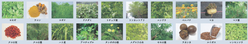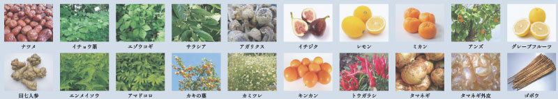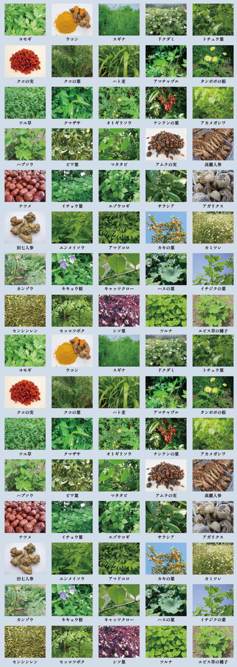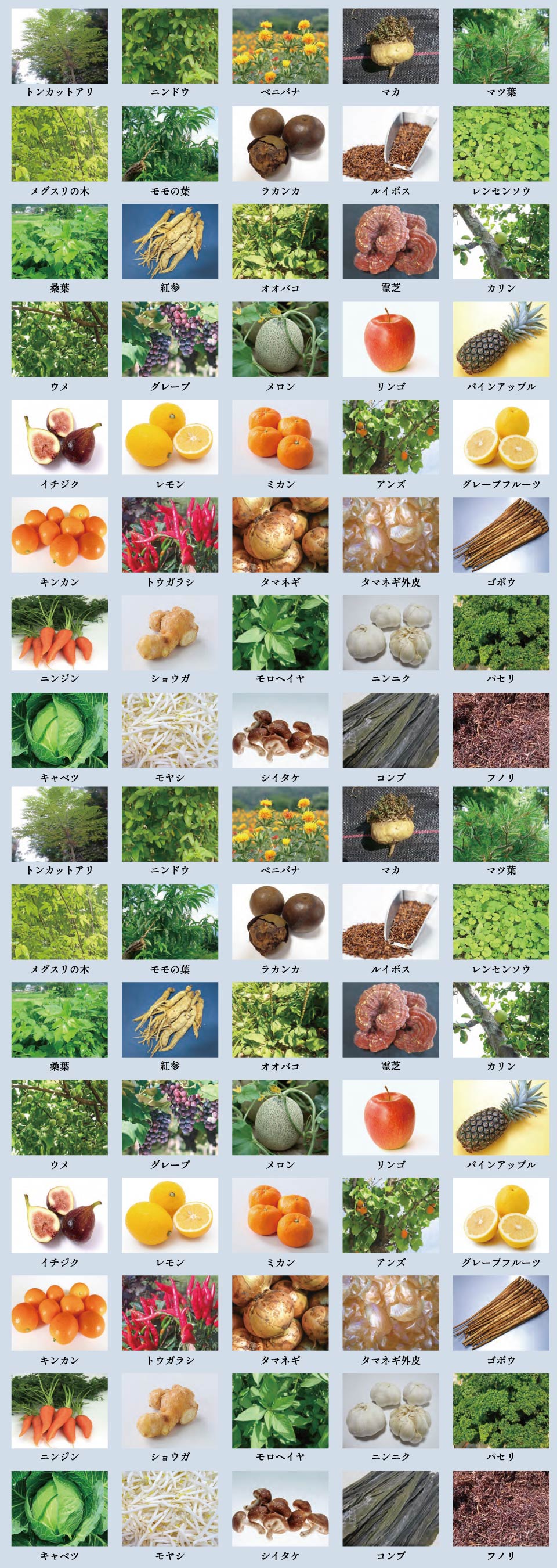 糖類(糖蜜(国内製造)、黒砂糖、オリゴ糖)、野草類(ヨモギ、ウコン、ドクダミ、ハスの葉、高麗人参、センシンレン、オトギリソウ、クマザサ、タンポポの根、霊芝、アマチャヅル、トチュウ葉、オオバコ、カンゾウ、マツ葉、ナンテンの葉、アマドコロ、ツユ草、ツルナ、マカ、トンカットアリ、ハブソウ、ハト麦、スギナ、ビワ葉、ラカンカ、クコの実、レンセンソウ、モモの葉、イチョウ葉、ニンドウ、イチジクの葉、ベニバナ、エゾウコギ、エンメイソウ、モロヘイヤ、セッコツボク、アカメガシワ、クコ葉、カキの葉、カミツレ、カリン、シソ葉、桑葉、メグスリの木、田七人参、キキョウ根、ナツメ、サラシア、マタタビ、エビス草の種子、紅参、アガリクス、ルイボス、アムラの実、タマネギ外皮、キャッツクロー)、果物類(ウメ、キンカン、イチジク、ミカン、パインアップル、リンゴ、グレープ、メロン、レモン、グレープフルーツ、アンズ)、野菜類(トウガラシ、ショウガ、シイタケ、ニンジン、タマネギ、パセリ、キャベツ、ゴボウ、モヤシ、ニンニク)、海藻類(コンブ、フノリ)
