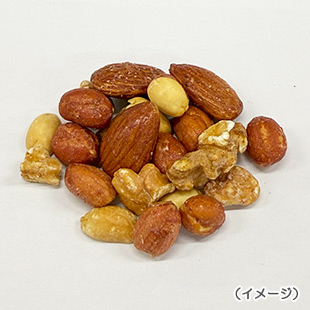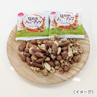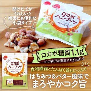 皮付きピーナッツ・くるみ・アーモンドをハニーバターで味付した、はちみつのほのかな甘さとバターのコクがまろやかなロカボマーク商品です。
