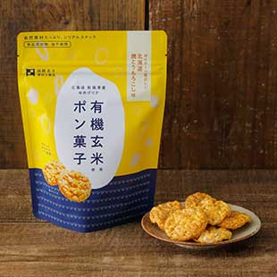 北海道産ゆめぴりか有機玄米のポン菓子を北海道産コーングリッツと甜菜シロップ、3年熟成たまり醤油で味付けしました。