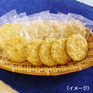 国内産うるち玄米に魚の骨から作られたカルシウムを混ぜ、直火で焼き上げ、醤油ダレで味付けした、胡麻風味のおせんべいです。