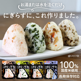 にぎらずにできる、長期保存可能な「携帯おにぎり」4種のお味のセットです。