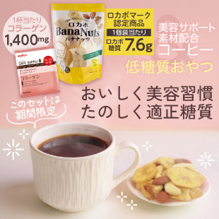 ハリのあるあなたにおすすめの1杯でコラーゲンペプチドが1400㎎摂れるコクのあるマイルドな味のカフェインレスコーヒーとキャラメル味のクルミが入ったミックスナッツにバナナチップをプラスしたロカボマークの商品とのセットです。