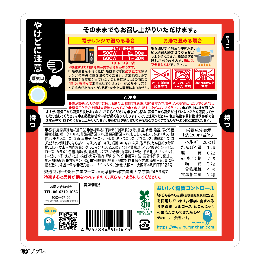 『セルロース学会で受賞した技術でつくる「糖質0gの麺」』独自の技術でつくりあげた『ぷるんちゃん』は、食物繊維「セルロース」とこんにゃくの主成分「グルコマンナン」からできた新しい糖質0g食品です。セルロースを主体的に使用しているため、いわゆる一般のこんにゃく製品とは異なり、こんにゃく独特のにおいが無く、ビーフンのような食感で従来のこんにゃくとは思えない食感です。スープまで全部飲んでも28kcal 糖質3.2g 食物繊維4.0g 糖質0gのぷるんちゃん細麺と旨辛韓国風海鮮チゲスープを入れた、即食タイプの低糖質麺です。