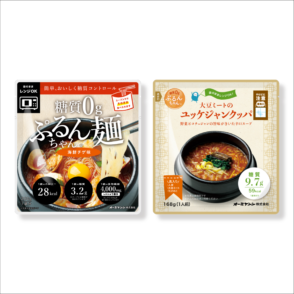 『セルロース学会で受賞した技術でつくる「糖質0gの粒と麺」』独自の技術でつくりあげた『ぷるんちゃん』は、食物繊維「セルロース」とこんにゃくの主成分「グルコマンナン」からできた新しい糖質0g食品です。セルロースを主体的に使用していますので、いわゆる一般のこんにゃく製品とは異なり、こんにゃく独特のにおいが無く、麺はビーフンのような食感で従来のこんにゃくとは思えない食感です。クッパはぷるんとした独特の食感がお楽しみいただけます。