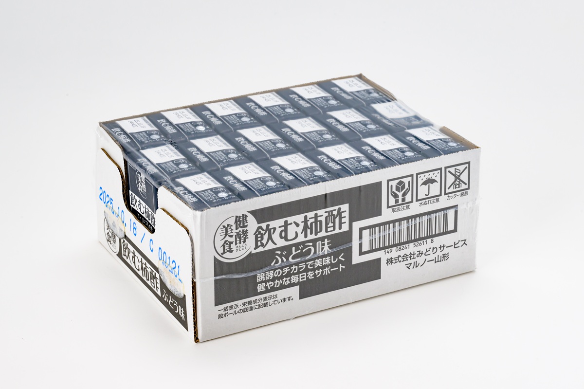庄内柿からつくった柿酢をたっぷり配合し、お酢好きも満足の飲みごたえ。ぶどうのやさしい甘みが酸味をまろやかに包み、さっぱりとした後味に。毎日続けたくなる、体にやさしい健康ドリンクです。持ち運びに便利な紙パックタイプで、どこでも気軽に美味しい柿酢を楽しめます。