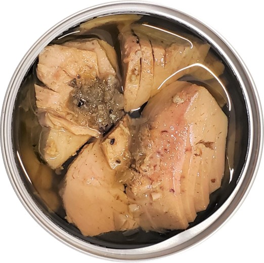 大きめにカットしたカツオに素材の旨味を引き出す黒潮町産天日塩を加え、数種類のハーブとブラックペッパーにユズで香りづけした特製オリジナルオイルで煮込んだ、素材の味が味わえる缶詰です。
