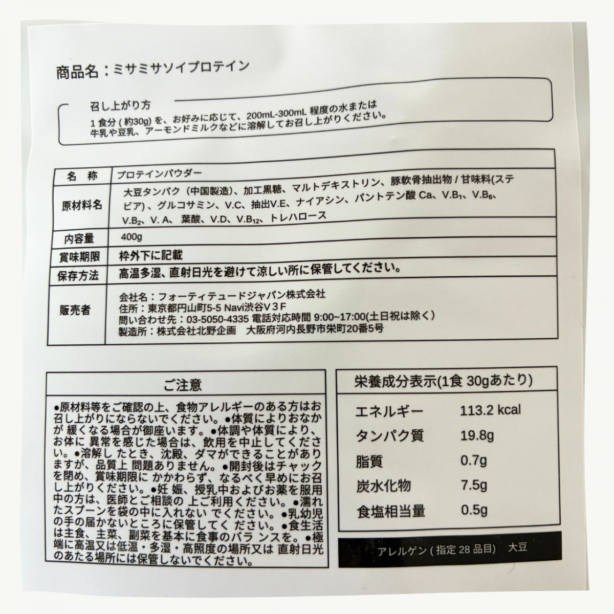 大豆タンパク(中国製造)、加工黒糖、マルトデキストリン、豚軟骨抽出物/甘味料(ステビア)。グルコサミン、V.C、抽出V.E、ナイアシン、パントテン酸Ca、V.B1、V.B6、V.B2、V.A、葉酸、V.D、V.B12、トレハロース