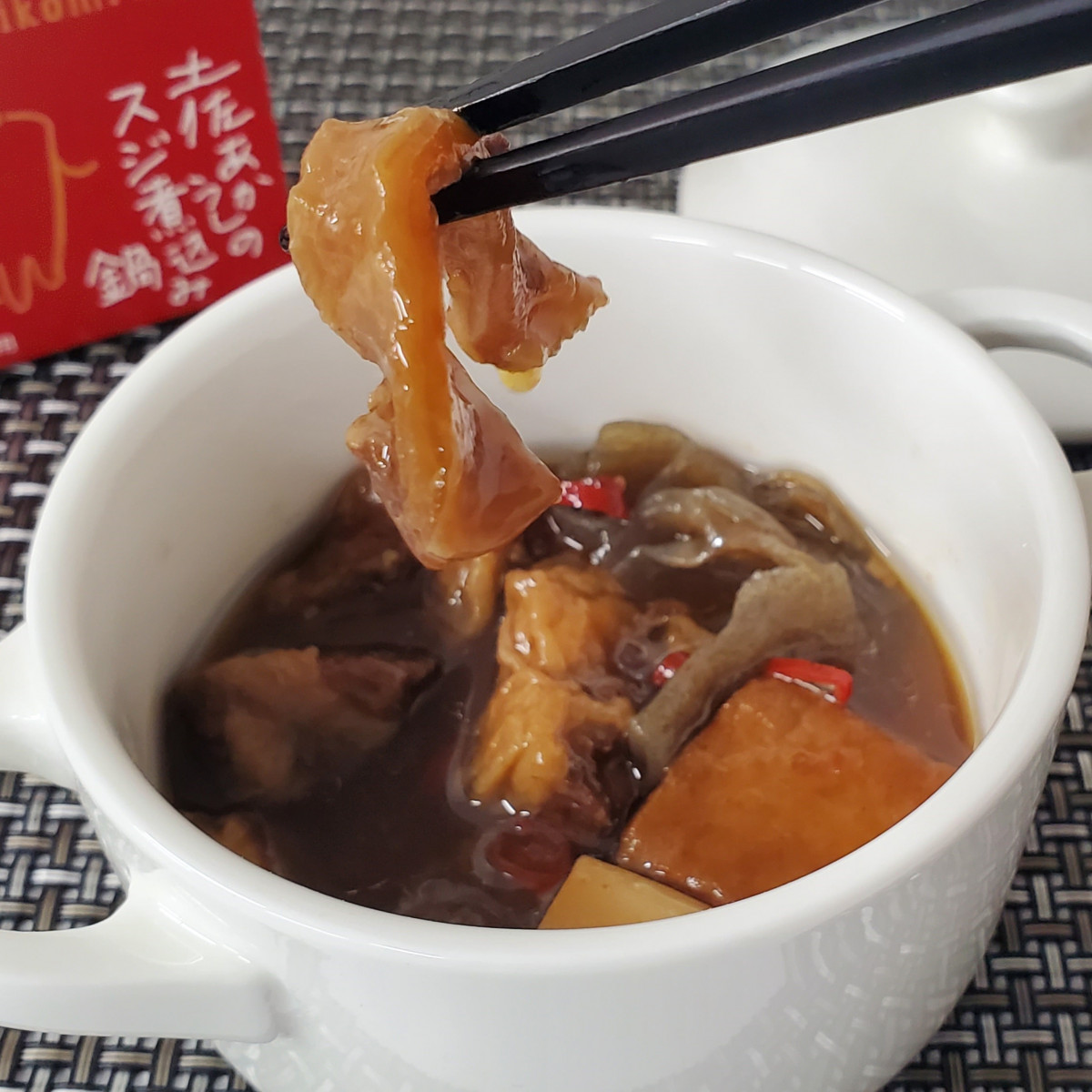 「高知生まれ、高知育ち」の希少な牛のスジ肉を生かし<手のひらサイズの鍋料理>に仕上げました。甘めの味付けですが黒潮町の特産品「サトウキビ蜜」を効かせることで、ついついスープを飲み干したくなるほど後味すっきり!スープを白ご飯や卵かけご飯にかけると2度おいしい。