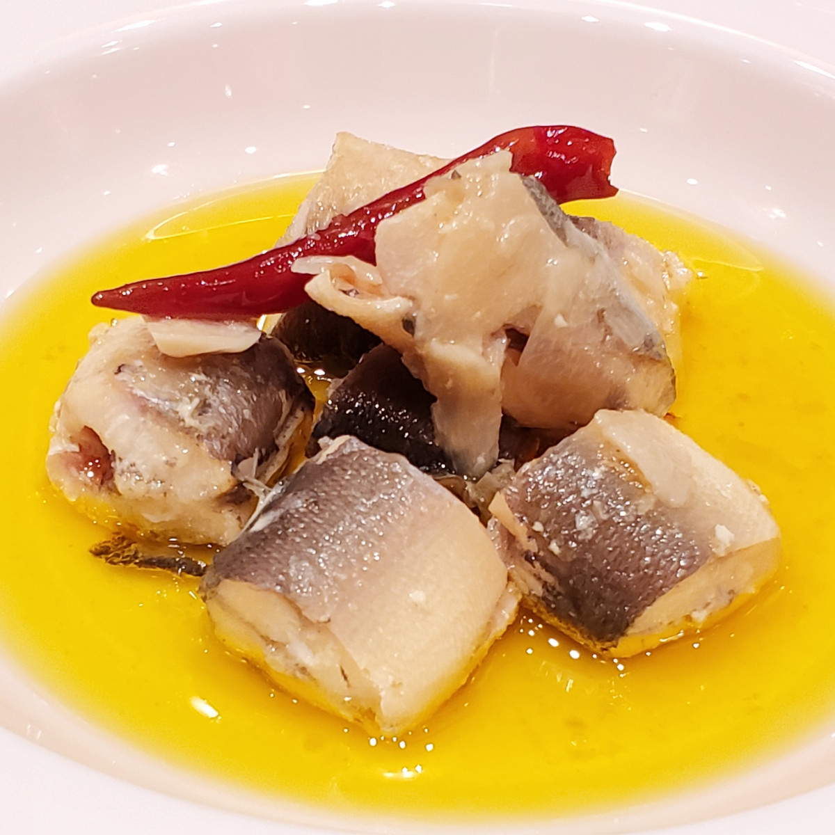 香魚と呼ばれる鮎の香りを生かしつつ、ニンニクとまるごと一本の唐辛子で味はワイルドに、色味は華やかに、五感にインパクトを放つ一品です。白ワイン、水、貝、プチトマト等を加え、塩コショウで味を整えれば、鮎のアクアパッツァの出来あがり。
