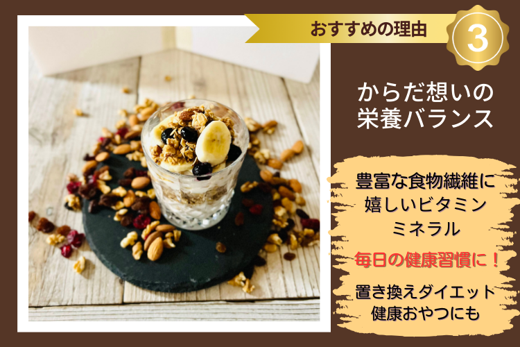 丁寧に手作業で焼き上げた、からだ想いの自家製グラノーラです。